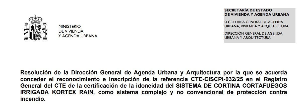 Our Kortex Rain EI fire curtain has been officially registered in the General Registry of the Technical Building Code (CTE), under the section on Technical Suitability Certifications for Fire Protection Systems.