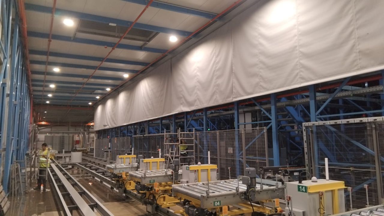 Para asegurar una correcta integración del sistema, se ha diseñado un primer tramo de 7 metros con una caída de 2 metros, incorporando un tramo de cortina fija Kortex DA Fix sobre la cortina automática. Esta solución permite salvar interferencias como tuberías e instalaciones existentes, manteniendo la continuidad y eficacia del sistema. El conjunto se completa con un segundo tramo de 53 metros con una caída de 3 metros, asegurando la correcta contención de los humos y gases calientes en caso de incendio.